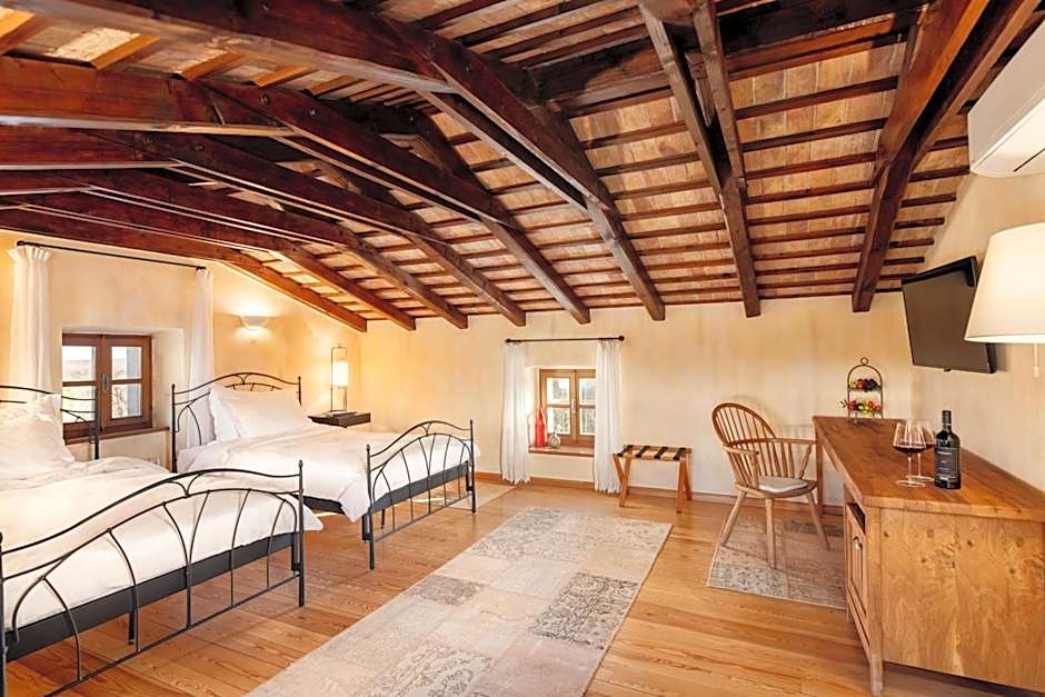 This charming room, overlooking vineyards and olive trees, stylishly combines antique and modern furniture. Wooden beams, hardwood floors, large wrought-iron beds and finest sheets provide luxury and comfort. The spacious bathroom features a walk-in shower, refined Croatian toiletries made of Mediterranean herbs as well as fluffy bathrobes and slippers.